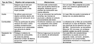 Los filtros se clasifican en tres categorías:  aire, combustible y aceite. La siguiente tabla presenta una sinopsis de cada uno de estos tres componentes.