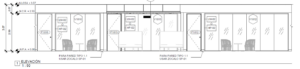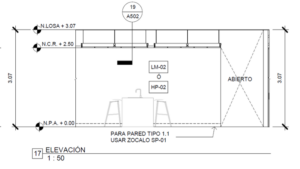 Sección con los espacios cerrados a la altura de 2.50 mts y los pasillos expuestos hasta la losa a la altura de 3.07 mts