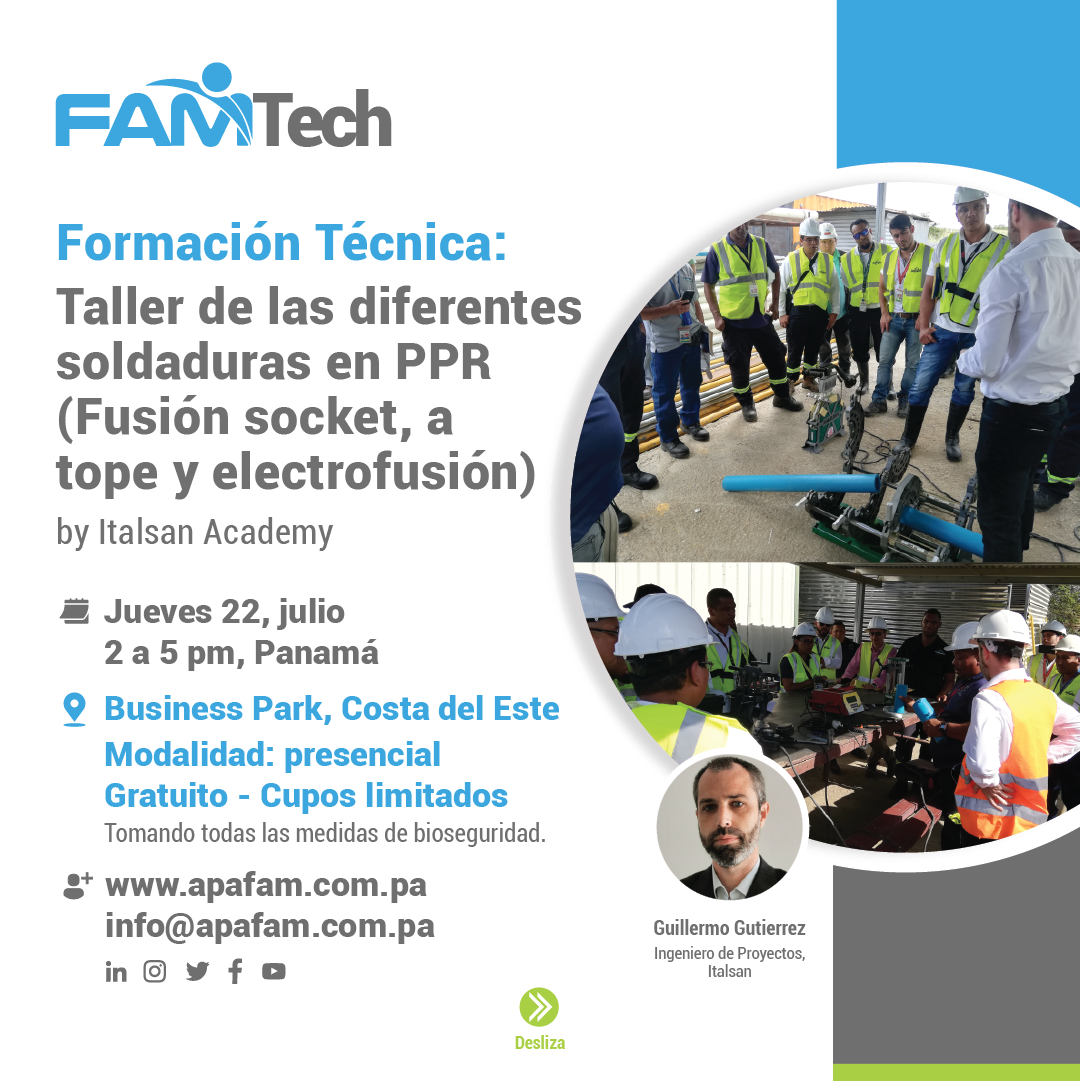 La Asociación Panameña de Facility Management, APAFAM e Italsan, les invitan al #FAMTech Formación Técnica: Taller de las diferentes soldaduras en PPR (Fusión socket, a tope y electrofusión).